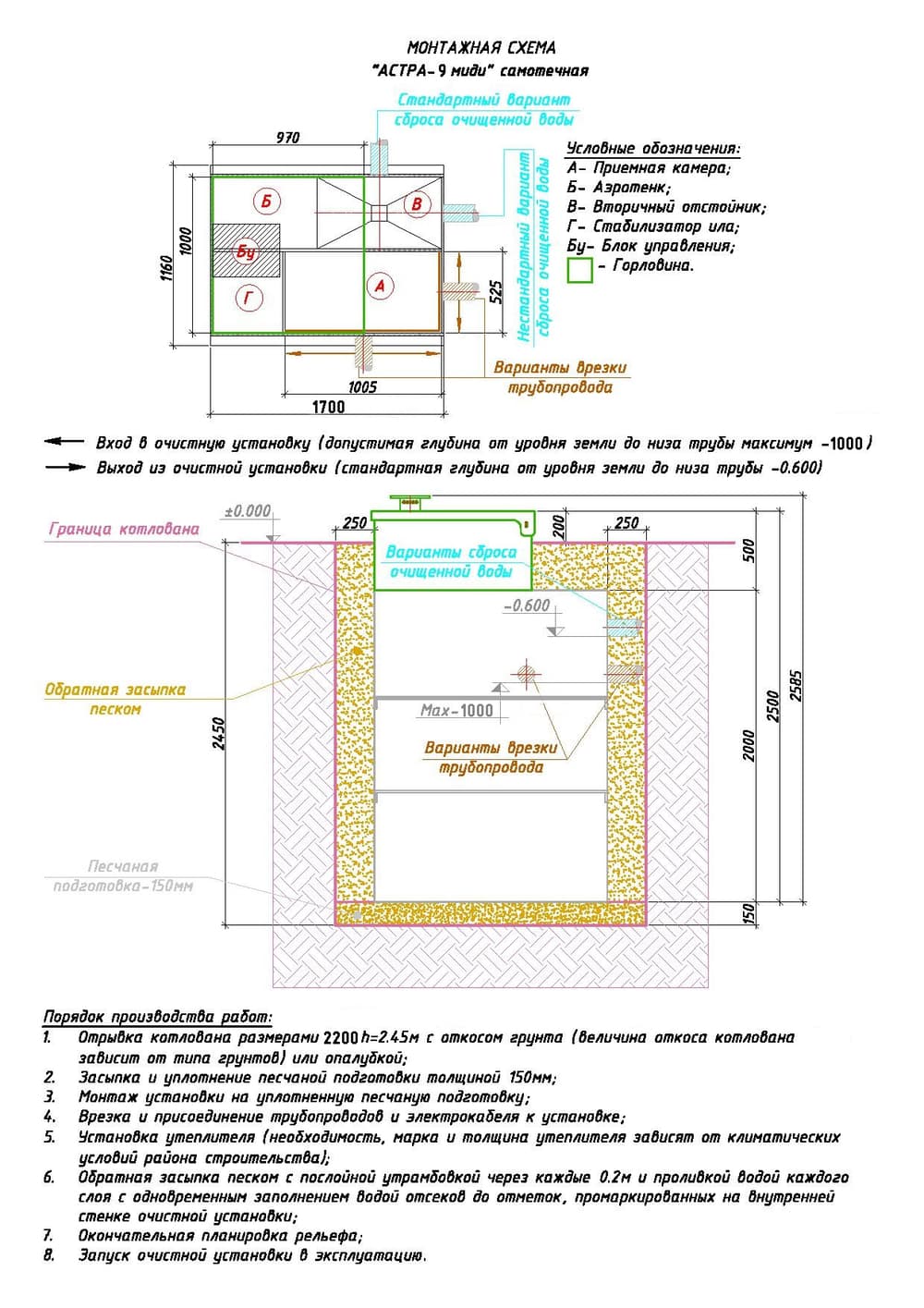 Отведение очищенных сточных вод самотеком в фильтрующий колодец, в условиях песчаных или супесчаных грунтов. При организации системы канализации Астра 9 в глине и суглинке или в условиях высокого уровня грунтовых вод - самотечное отведение в фильтрующий колодец, в случае переполнения с отводом воды на рельеф (в пределах границ частного домовладения, а за их пределами по согласованию с органами санитарного надзора) принудительно с помощью насоса.